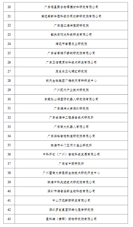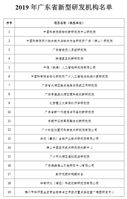 根據(jù)《廣東省科學技術(shù)廳關于發(fā)布2019~2020年度新型研發(fā)機構(gòu)建設指南的通知》(粵科函資字〔2019〕1309號)文件精神,經(jīng)組織專家評審,現(xiàn)將擬認定的2019年廣東省新型研發(fā)機構(gòu)名單予以公示,公示期自10月15~21日,共7天。如有異議,請于公示期內(nèi)向省科技廳反映。以個人名義反映情況的,請?zhí)峁┱鎸嵭彰⒙?lián)系方式和反映事項的證明材料等;以單位名義反映情況的,請?zhí)峁┱鎸崋挝幻Q(加蓋公章)、聯(lián)系人、聯(lián)系方式和反映事項的證明材料等。