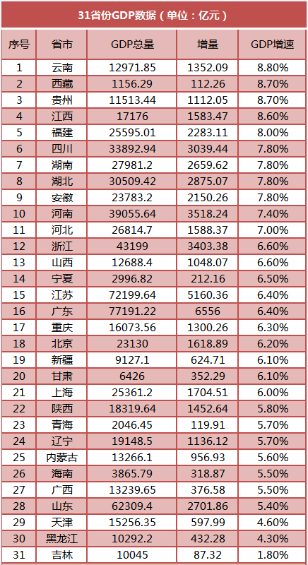 2019年前三季度,中國國內生產總值697798億元,按可比價格計算,同比增長6.2%同全國水平相比,云南、貴州、西藏、江西、福建、四川、湖北、湖南、安徽、河南、河北、浙江、山西、寧夏、廣東、江蘇、重慶這17省份前三季度GDP增速跑贏全國。