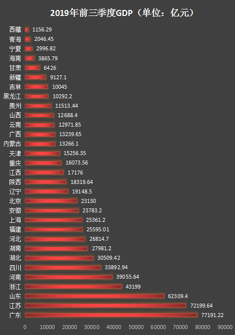 廣東前三季度GDP77191.22億元,以絕對的優勢位居榜首。數據顯示,2018年廣東全年GDP97277.77億元,以目前的漲勢來看,廣東今年全年的GDP有望達到10萬億元大關。