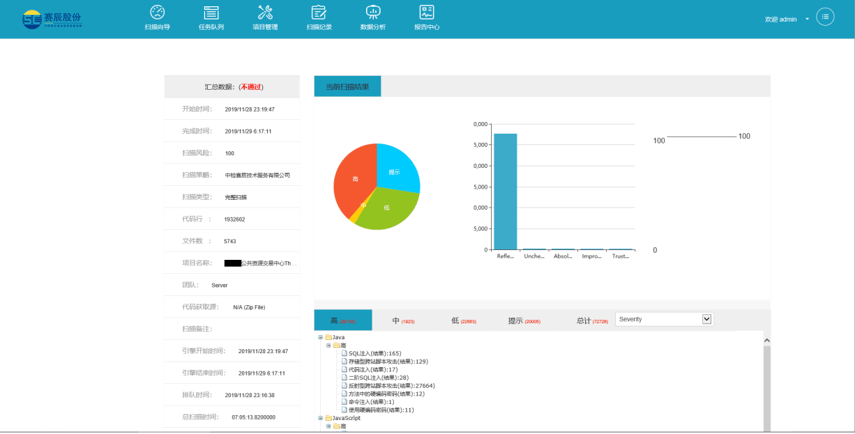 針對系統開發過程中的編碼階段、測試階段、交付驗收階段、對各階段系統源代碼進行安全審計檢測,利用數據流分析引擎、語義分析引擎、控制流分析引擎等技術,采用專業的源代碼安全審計工具對源代碼安全問題進行分析和檢測并驗證,從而對源代碼安全漏洞進行定級,給出安全漏洞分析報告等,幫助軟件開發的管理人員統計和分析當前階段軟件安全的風險、趨勢,跟蹤和定位軟件安全漏洞,提供軟件安全質量方面的真實狀態信息。