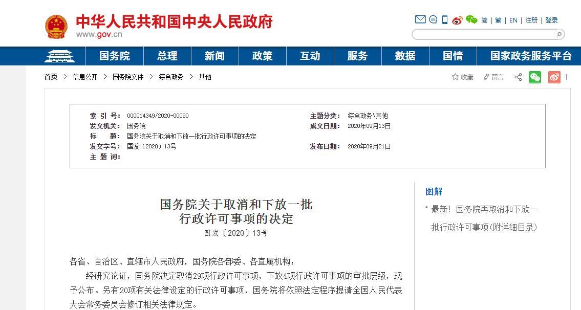 經(jīng)研究論證,國務院決定取消29項行政許可事項,下放4項行政許可事項的審批層級,現(xiàn)予公布。另有20項有關(guān)法律設定的行政許可事項,國務院將依照法定程序提請全國人民代表大會常務委員會修訂相關(guān)法律規(guī)定。
