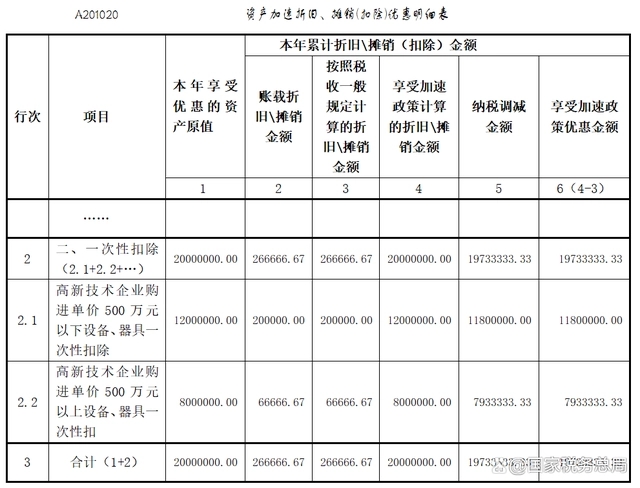 第一步,先填報(bào)一次性扣除情況。對于單價(jià)500萬元以下設(shè)備、器具,在《資產(chǎn)加速折舊、攤銷(扣除)優(yōu)惠明細(xì)表》(A201020)第2行“二、一次性扣除”下的明細(xì)行次中填寫“高新技術(shù)企業(yè)購進(jìn)單價(jià)500萬元以下設(shè)備、器具一次性扣除”事項(xiàng)及“本年享受優(yōu)惠的資產(chǎn)原值”等信息;對于單價(jià)500萬元以上設(shè)備、器具,填寫“高新技術(shù)企業(yè)購進(jìn)單價(jià)500萬元以上設(shè)備、器具一次性扣除”事項(xiàng)及“本年享受優(yōu)惠的資產(chǎn)原值”等信息。填寫完畢后,將該表單中“納稅調(diào)減金額”列次的合計(jì)值(第3行第5列)填寫在《中華人民共和國企業(yè)所得稅月(季)度預(yù)繳納稅申報(bào)表(A類)》(A202000)第6行“資產(chǎn)加速折舊、攤銷(扣除)調(diào)減額(填寫A201020)”中。